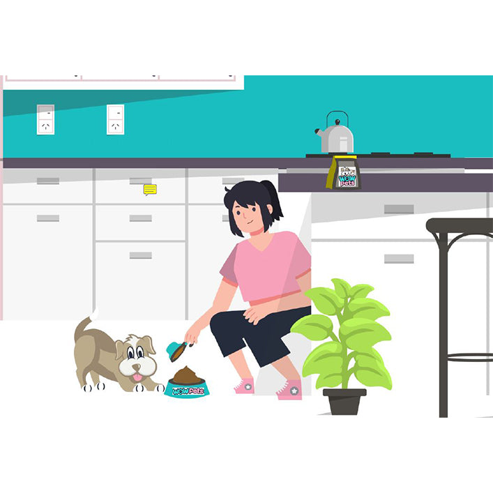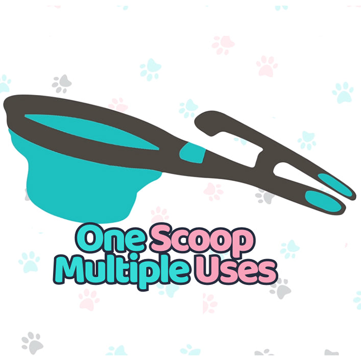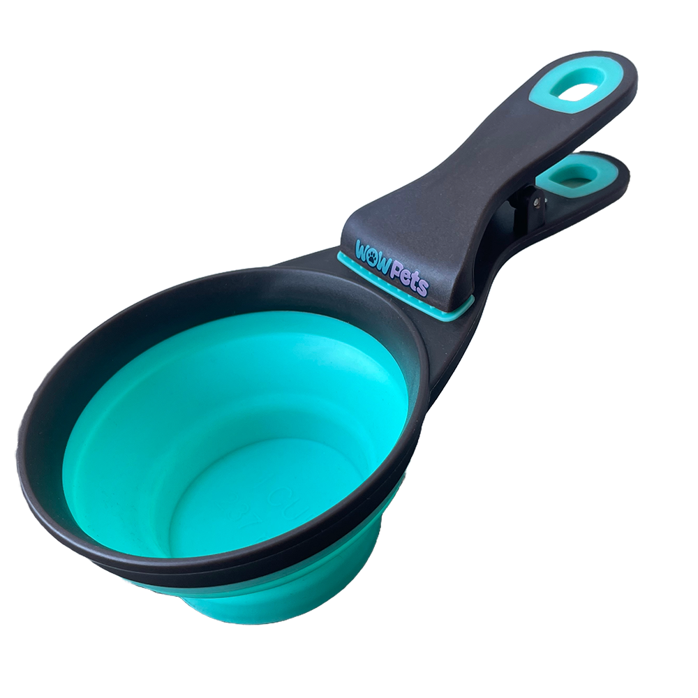 The Wow Pets Collapsible Scoop functions as a pet food scoop, bag sealing clip, travel bowl, measuring cup, water bowl, and even a pet food can cover.